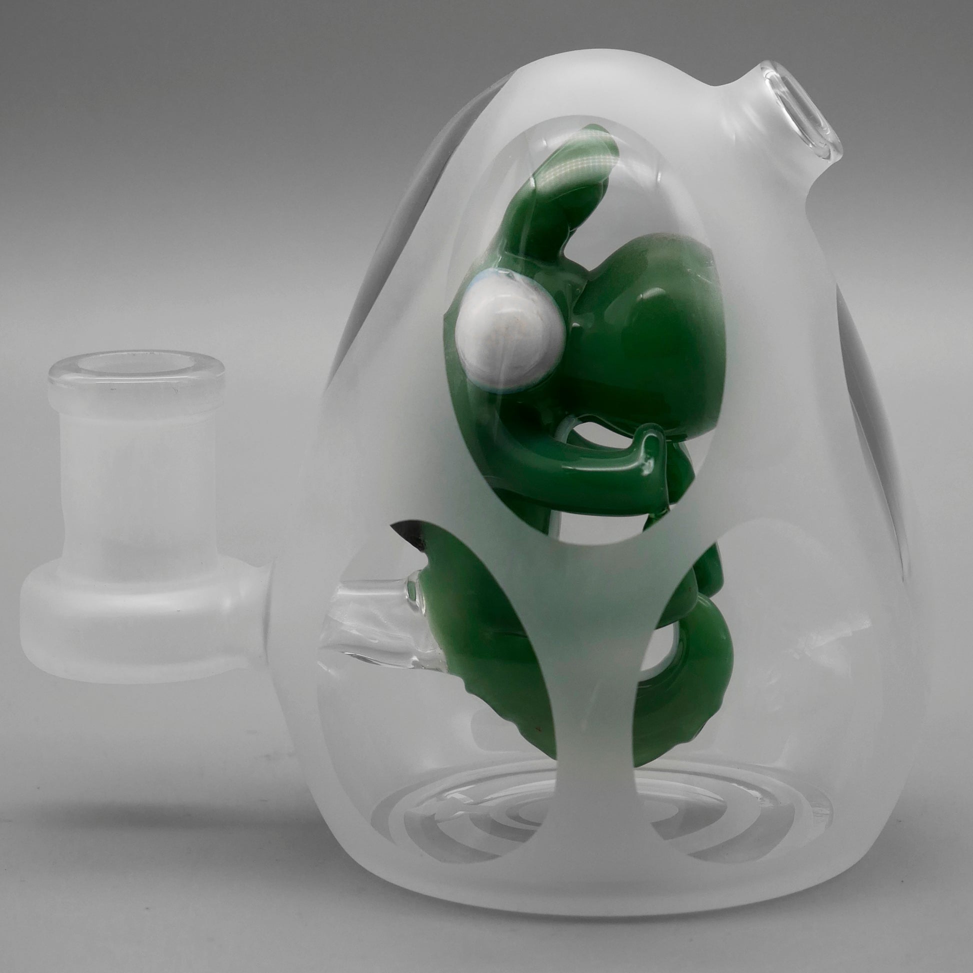 The 4" Encore Collection Yoshi Frosted Egg Dab Rig combines playful design with dependable function in a compact, easy-to-handle size. Crafted from borosilicate glass, this frosted egg-shaped dab rig features a detailed Yoshi figurine housed inside the body, creating a distinctive character-driven look without sacrificing performance. Available in Blue,Green, Teal, Mint, Jade Blue, Milky Green, Milky Purple, and Jade Green, each piece is finished with a sandblasted Encore seal on the bottom.